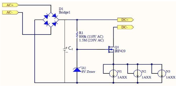 最簡單的方法就是和恒流二極管串聯(lián)一個齊納二極管來提高耐壓(圖15)。