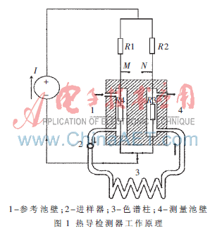 熱導(dǎo)檢測器是利用被測成分和載氣的導(dǎo)熱系數(shù)不同而響應(yīng)的濃度型檢測器,如圖1為熱導(dǎo)檢測器工作原理圖。由圖1可以看出,只通入載氣時(shí),惠斯通電橋處于平衡狀態(tài),M、N兩點(diǎn)電位相等,電位差VMN為零。再通入樣氣后,由于參考臂上通入的是純載氣,而測量臂上通入的是載氣和樣氣的混合氣體,其導(dǎo)熱系數(shù)不同于純載氣,從熱絲向四周傳導(dǎo)的熱量也就不同,從而引起兩臂熱絲溫度不同,進(jìn)而使兩臂熱絲阻值不同,電橋平衡破壞。M、N兩點(diǎn)電位不等,即存在電位差VMN不為零,通過對(duì)VMN電壓進(jìn)行檢測、分析,從而定性、定量地測出被測物質(zhì)的成分和含量。
