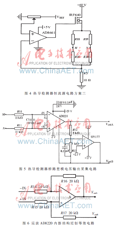 本文對(duì)三套恒流源進(jìn)行分析、比較、實(shí)驗(yàn),表明方案一的基線噪聲、溫度漂移小,優(yōu)于現(xiàn)有色譜儀熱導(dǎo)檢測器的指標(biāo),而且電橋檢測電路承受的共模電壓小,有利于保護(hù)檢測電路。
