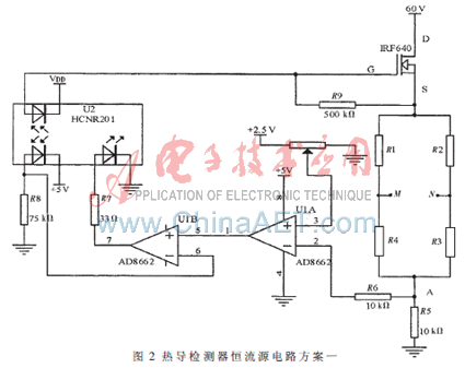 如圖2所示為恒流源的電路圖。輸出信號(hào)為M、N,即通過測量M、N兩點(diǎn)間的電位差,就能測出物質(zhì)的成分和含量。圖2中R5是采樣電阻,阻值10 Ω,當(dāng)電流為上限250 mA時(shí),采樣電壓為2.5 V,采樣電壓輸入到AD8662的2腳,AD8662的3腳接電位器RW,RW的一端接地,另一端接+2.5 V電壓基準(zhǔn),此+2.5 V是通過穩(wěn)壓芯片ADR431輸出,溫度穩(wěn)定1 ppm/℃。設(shè)定好電位器的電壓后,當(dāng)AD8662的2腳、3腳電壓不相等時(shí),其差壓經(jīng)運(yùn)放AD8662開環(huán)放大(開環(huán)放大倍數(shù)2.2×105)驅(qū)動(dòng)AD8662的5腳,U1B和線性光耦HCNR201構(gòu)成光耦隔離的放大電路,放大比為500 K/75 K=6.7倍。AD8662和HCNR201構(gòu)成放大比1.47×106的差壓放大電路,并且起到穩(wěn)流作用。當(dāng)橋流有0.1 μA的波動(dòng)時(shí),施加到IRF640柵極的電壓變化達(dá)1.47 V,使IRF640增加或減小電流,從而消除電流波動(dòng)。
