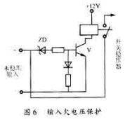 在該電路中,當輸入直流電源的電壓高于穩壓二極管的擊穿電壓值時,穩壓管擊穿,有電流流過電阻R, 使晶體管V導通,繼電器動作,常閉接點斷開,切斷輸入。其中穩 壓管的穩壓值Vz=ESrmax-UBE。輸入 電源的極性保護電路可以跟輸入過電壓保護結合在一起,構成極性 保護鑒別與過電壓保護電路。