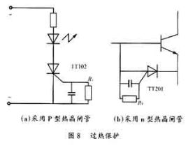 采用溫度繼電器來檢測電源裝置內部的溫度,當電源裝置內部產生過熱時,溫度繼電器就動作,使整機告警電路處于告警狀態,實現對電源的過熱保護。亦可將溫度繼電器置于開關三極管的附近,一般大功率管允許的最高管殼溫度是75℃,調節溫度整定值為60℃。當管殼溫度超過允許值后繼電器就切斷電器,對開關管進行保護。半導體熱敏開關器件“熱晶閘管”在超溫保護方面有重要作用。它可以用作溫度指示電路。根據p型控制柵熱晶閘管(TT102)的特性,由RT值確定該器件的導通溫度,RT越大,導通溫度越低。當將其放置功率開關三極管附近,或在電源裝置內時,它就能起到溫度指示作用。當功率管的管殼溫度或者裝置內部的溫度超過允許值時,熱晶閘管就導通,使發光二極管發亮告警。倘若配合光電耦合器,就可使整機告警電路動作,保護開關穩壓器。它亦可以象圖8(b)那樣用作功率晶體管的過熱保護,晶體開關管的基極電流被n控制柵型熱晶閘管TT201旁路,開關管截止,切斷集電極電流,防止過熱。