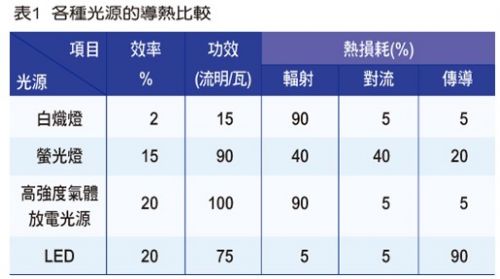 在此情況下,約20%輸入功率轉(zhuǎn)換為光,80%則轉(zhuǎn)換為熱。這取決于多種因素,發(fā)熱可能與底層不規(guī)則以及聲子發(fā)射、密封、材料等有關(guān)。在LED產(chǎn)生的總熱量中,有90%透過(guò)傳導(dǎo)傳輸。表1為耗散來(lái)自LED接面的熱量,傳導(dǎo)是導(dǎo)熱的主要通道,因?yàn)閷?duì)流和輻射僅占全部熱傳輸約10%。比如一個(gè)LED可能轉(zhuǎn)換近10.72瓦熱量(13.4瓦×0.8)。其中,9.648瓦(10.72瓦×0.9)透過(guò)傳導(dǎo)從LED接面?zhèn)鬏敾蜻w移。顯然,LED光源需要精確的功率和熱管理系統(tǒng),因?yàn)榕c其他光源相比,提供給LED的電能大部分轉(zhuǎn)換為熱量。如果沒(méi)有適當(dāng)?shù)臒峁芾恚@種熱量會(huì)影響LED壽命和色彩輸出。同時(shí)由于LED驅(qū)動(dòng)裝置屬于硅組件,很快就會(huì)失效,因此必須配備故障安全備用過(guò)電流保護(hù)裝置。