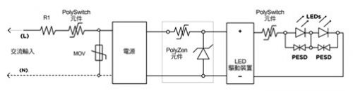 目前,多數(shù)LED應(yīng)用利用功率轉(zhuǎn)換和控制組件連接各種功率源,如交流電線、太陽(yáng)能電池板或電池,來(lái)控制LED驅(qū)動(dòng)裝置的功率耗散。對(duì)這些接口加以保護(hù),防止它們因過(guò)流和過(guò)溫而受損,常常用到具有可復(fù)位能力的聚合物正溫度系數(shù)(PPTC)組件(圖2)。可以與功率輸入串聯(lián)一個(gè)PolySwitch LVR組件,防止因電氣短路、電路超載或用戶誤操作而受損。此外,放在輸入端上的金屬氧化物變阻(MOV)也有助于LED模塊內(nèi)的過(guò)壓保護(hù)。