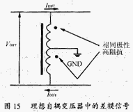 從差模信號(hào)看,有中心抽頭的自耦變壓器是兩個(gè)在相位上相同的對(duì)分繞組,見圖15。這就意味差模電流在其中所形成的磁場,會(huì)使其對(duì)差模電流呈現(xiàn)高阻抗。相當(dāng)于對(duì)差模信號(hào)并聯(lián)了一個(gè)高阻值的阻抗,它對(duì)差模信號(hào)的大小沒有影響。