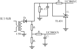 電流反饋電路采用電流互感器檢測開關管上的電流,原理如圖2所示。電流互感器的輸出分為電流瞬時值反饋和電流平均值反饋兩路,R2上電壓反映電流瞬時值,開關管上的電流增大會使UR2增大,當UR2大于1V時,UC3843芯片輸出脈沖關斷。調節(jié)R1、R2分壓比可改變開關管的限流值,實現(xiàn)電流瞬時值的逐周期比較,這屬于限流式保護。輸出脈沖關斷,實現(xiàn)對電流平均值的保護,這屬于截流式保護。兩種過流保護互為補充,使電源更為安全可靠。采用電流互感器采樣使控制電路與主電路隔離,同時與電阻采樣相比降低了功耗,有利于提高整個電源的效率。