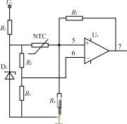 圖4為變壓器過熱保護電路,R3=R4,NTC為粘貼在變壓器上的負溫度系數(shù)的熱敏電阻,常溫下RNTCR2,運放U1構成滯環(huán)比較器。正常工作時,NTC阻值較大,運放U+<U-,輸出為零;當溫度上升到設定值時,運放U1輸出為高電平,送到PWM控制芯片使輸出脈沖關斷。