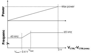 VCTRL與功率及頻率的關(guān)系:當(dāng)輸出功率下降時(shí),VCTRL隨之下降;當(dāng)?shù)竭_(dá)反走設(shè)定點(diǎn)時(shí),頻率線性下降;65 kHz版本將最小頻率內(nèi)部設(shè)定為40 kHz。