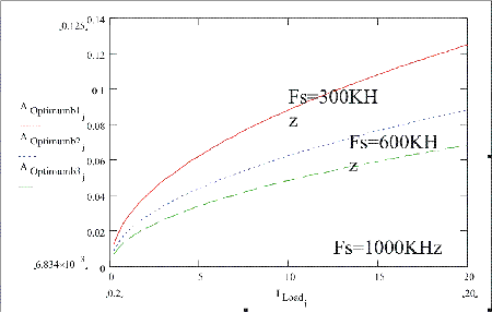 圖4:在同步整流器MOSFET不同開關頻率上的最優化裸片面積是負載電流的函數。