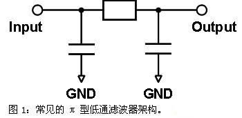 為有效解決電子產品電磁干擾的問題,并能兼顧靜電放電(ESD)防護的功用,可以采用具有靜電放電防護功能的電磁干擾濾波器(EMI+ESD filter)。圖1所示即為常見的π型低通濾波器。在Input及Output端點之間的組件,可以是電阻或是電感組件。是采用電阻還是電感,應視產品的實際應用所需而定。