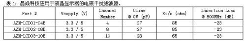 表1所列為晶焱科技已推出的應用于液晶顯示器的電磁干擾濾波器系列產品。適用于5V以下的額定電壓電路系統,線電容值約為27微微法拉(pF)。操作頻率在800百萬赫茲(MHz)時,其功率損耗可達-23dB,可以顯著地降低電磁干擾信號,以維持受保護電路的操作功能正常。晶焱科技同時推出三種不同通道數的電磁干擾濾波器產品,以方便其客戶依照不同需求選用合適的產品。