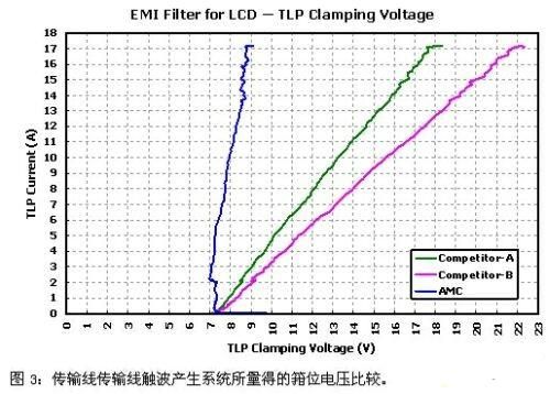 在靜電放電事件的高導通電流下,瞬時電壓抑制器的箝位電壓越低則越能適時地被導通,以使受保護電路免于遭受靜電放電的侵害而永久受損失效。圖3所示為利用傳輸線脈沖產生系統(TLP)所量得的箝位電壓比較圖。由圖中可以清楚看到,晶焱科技應用于液晶顯示器的電磁干擾濾波器,在17安培的高靜電放電電流下具有最低的箝位電壓,可以非常有效地提供受保護電路一個快速有效的靜電放電旁通路徑。