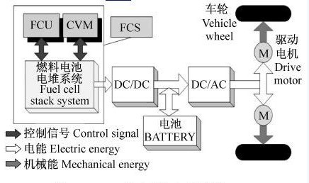 (1)串聯式—下圖中采用的電力電子裝置只有電機控制器,電池和輔助動力裝置都直接并接在電機控制器的入口,屬于串聯式,車輛的驅動力只來源于電動機。