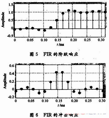 點擊“design filter”即可。值得注意的是,這里選擇filter order為15階,而不是所設計的16階濾波器。因為常數系數項h(0)=0。通過菜單“analysis”選擇“magnitude”和“phase response”即可得到圖3,圖4的特性顯示。“analysis”選擇“step response”和“im-pulse”可以得到圖5,圖6的響應顯示??梢钥闯鏊O計FIR濾波器的階躍響應和沖擊響應比較接近理想狀態。