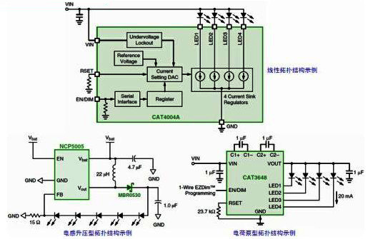 白光LED廣泛用于小型液晶顯示器(LCD)面板及鍵盤背光以及指示器應用。高亮度LED則用于手機和數碼相機的閃光光源。這些應用需要優化的驅動器解決方案,能夠延長電池使用時間、減小印制電路板(PCB)面積及高度。在這些應用領域,常見的LED驅動器方案涉及線性、電感型或電荷泵型不同拓撲結構,各有其特點。例如,電感型方案總能效最佳;電荷泵方案由于使用低高度陶瓷電容,占用的電路板面積和高度極??;線性方案非常適合色彩指示器以及簡單的背光應用。安森美半導體提供所有這三種類型拓撲結構的LED驅動器方案(參見圖1),滿足用戶不同的應用需求。