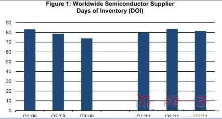 第三季度半導體庫存天數(DOI)為81天,比第二季度的83天下降2.5%。自從2009年第四季度以來,庫存天數就持續增加。2009年第四季度庫存天數只有67天,由于需求在衰退時期蒸發,當時庫存較低。此后,庫存天數不斷攀升,如圖1所示。庫存上升,一方面是因為需要補充衰竭的庫存,同時也是為了滿足不斷增長的需求。第三季度庫存約為369.6億美元,低于第二季度時的372.9億美元。