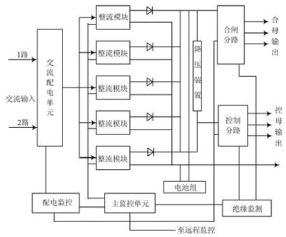 智能高頻開(kāi)關(guān)電源系統(tǒng)的總體結(jié)構(gòu)主要由主監(jiān)控單元、配電模塊、交流配電單元、整流模塊等組成, 系統(tǒng)總體的結(jié)構(gòu)圖如圖1 所示。系統(tǒng)中的各個(gè)監(jiān)控單元受主監(jiān)控單元的管理和控制,通過(guò)通信線將各個(gè)監(jiān)控單元采集的信息送給主監(jiān)控統(tǒng)一管理。主監(jiān)控顯示直流系統(tǒng)各種信息,用戶也可以觸摸顯示屏查詢信息及操作,系統(tǒng)信息還可以接入到遠(yuǎn)程監(jiān)控系統(tǒng)中。系統(tǒng)除了交流監(jiān)控、直流監(jiān)控、開(kāi)關(guān)量監(jiān)控等基礎(chǔ)單位外,還配置了絕緣監(jiān)測(cè)、降壓裝置、電池巡檢等功能單元,以達(dá)到對(duì)直流系統(tǒng)進(jìn)行全面監(jiān)控的目的。