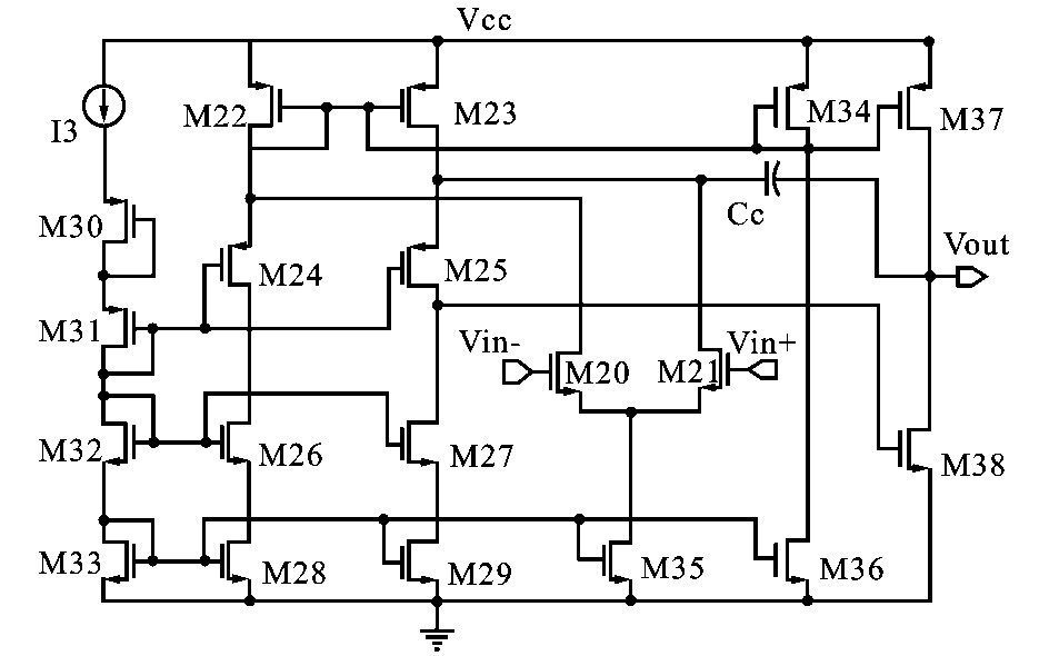 以上分析可知運(yùn)算放大器起著重要作用,其必須具有較高的增益,才能使A 點(diǎn)電壓精確跟隨參考電壓,從而準(zhǔn)確設(shè)定B 點(diǎn)電平和滯環(huán)電壓大小。 另外由于V out的變化頻率與系統(tǒng)開關(guān)頻率相同(系統(tǒng)的最大開關(guān)頻率約為2MHz) ,使得流過M1 的電流也相同頻率在IM1和I′M1之間快速切換,所以運(yùn)放的單位增益帶寬須大于系統(tǒng)的最大開關(guān)頻率。 設(shè)計(jì)的運(yùn)放結(jié)構(gòu)如圖4 所示,采用折疊式輸入結(jié)構(gòu),可以獲得較大的共模輸入電壓范圍。