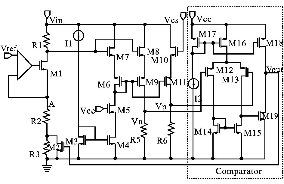 4. 5V~28V 的輸入電壓經(jīng)調(diào)整轉(zhuǎn)換為5V 的恒定電壓Vcc 為后續(xù)電路供電。 如圖3 所示,A 點(diǎn)電位受運(yùn)算放大器鉗制,將等于參考電壓1. 2V ,假設(shè)輸出V out 為高電平,則M2 導(dǎo)通,流過M1 的電流為IM1 = V ref / R2 ,B 點(diǎn)的電壓為V BL = V in - IM1 R1 ;當(dāng)V out為低電平,M2 截止,流過M1 的電流變?yōu)镮′M1= V ref / ( R2 + R3 ) ,B 點(diǎn)電壓升高為V BH = V in -I′M1 R1 ,所以B 點(diǎn)電壓的變化為ΔV B = V BH - V BL= V ref R1 R3/ R2 ( R2 + R3) ,這意味著V out由高電平變成低電平時(shí)在B 點(diǎn)產(chǎn)生的一個(gè)滯環(huán)電壓,可見該滯環(huán)電壓與輸入電壓無關(guān),只由參考電壓V ref和電阻大小決定,通過選擇各電阻的阻值便可設(shè)定滯環(huán)電壓的大小。