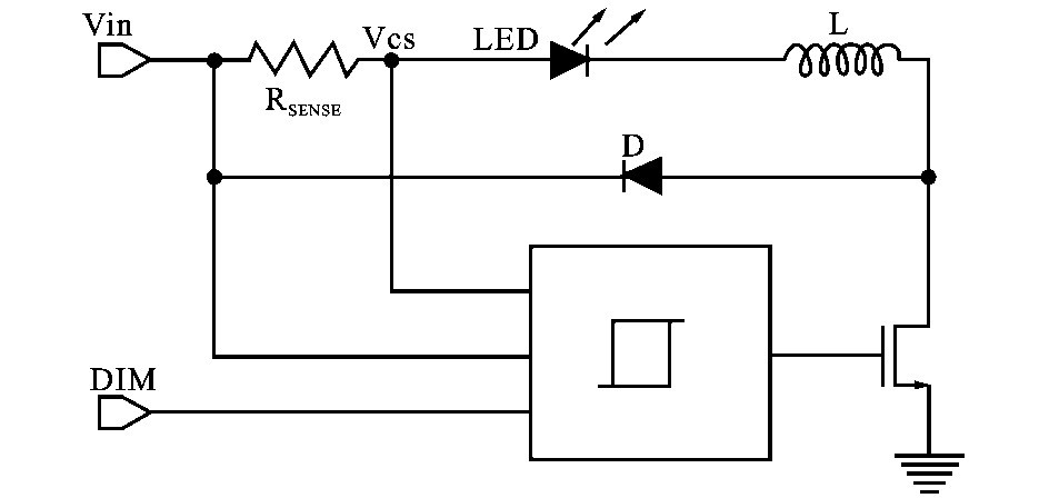 滯流控制模塊應(yīng)用如圖1 所示,L ED 驅(qū)動(dòng)電流的變化反應(yīng)在檢測電阻RSENSE兩端的壓差變化上。 本設(shè)計(jì)中,檢測電阻設(shè)為0. 5Ω ,較小的檢測電阻有利于降低功耗和保持較高的轉(zhuǎn)換效率。 滯環(huán)電流控制模塊內(nèi)部自建兩個(gè)電壓閾值,檢測電壓Vcs與閾值電壓進(jìn)行比較,比較結(jié)果和DIM 調(diào)光信號(hào)相與來控制功率開關(guān)管的通斷。