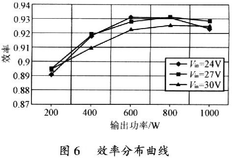 圖6為該變換器在24V、27V、30V輸入時對應不同輸出功率的的效率分布曲線圖。其中輸入電壓為24V,輸出功率600W時最高效率可達93.1%,27V滿載1 000W時效率為92.8%。