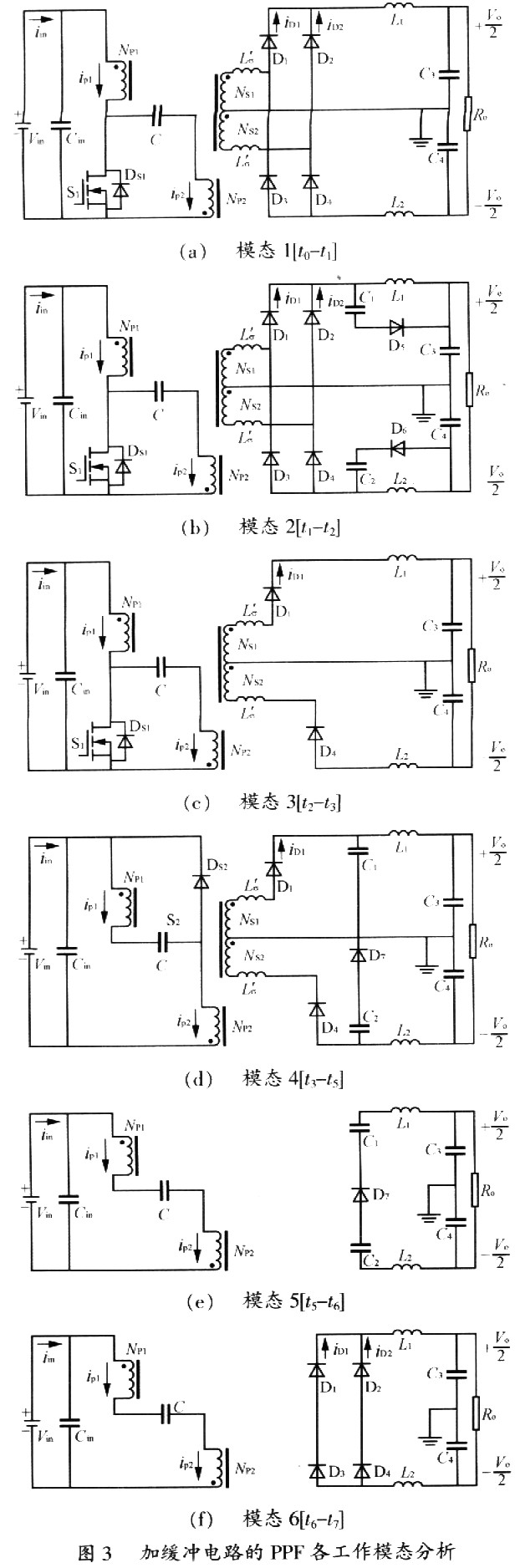 圖2為加無損緩沖吸收的PPF電路工作原理波形圖,一共分為14個工作模態。