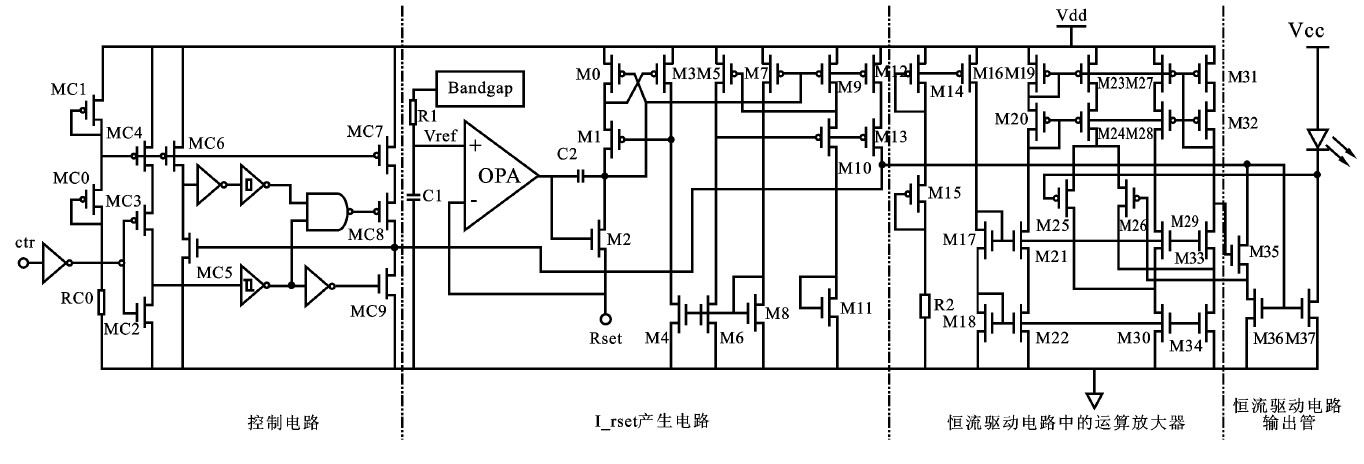 整個控制模塊利用施密特觸發(fā)器實現(xiàn)電平的準(zhǔn)確翻轉(zhuǎn),通過邏輯門作用于MC8、MC9.這兩個MOS管在控制信號發(fā)生翻轉(zhuǎn)時迅速將電平拉高或拉低,實現(xiàn)了對控制信號控制功能的加速作用,電路的響應(yīng)速度快。當(dāng)ctr信號為高時輸出禁止,ctr信號為低時輸出允許,從而實現(xiàn)利用外部的PWM信號實現(xiàn)調(diào)光功能。I_rset產(chǎn)生電路要實現(xiàn)通過外設(shè)電阻Rset對I_rest大小的控制,并且對與固定的Rset可以恒流輸出。利用帶隙電壓源產(chǎn)生一個基準(zhǔn)電壓,利用運放實現(xiàn)基準(zhǔn)電壓到基準(zhǔn)電流的轉(zhuǎn)換。將運放的反相端連接到外設(shè)電阻Rset就實現(xiàn)了轉(zhuǎn)換的電流大小受控于Rset.通過后續(xù)電路將電流適當(dāng)放大,最終給出I_rset.總體電路利用確立好的恒流驅(qū)動模塊實現(xiàn)恒流輸出。