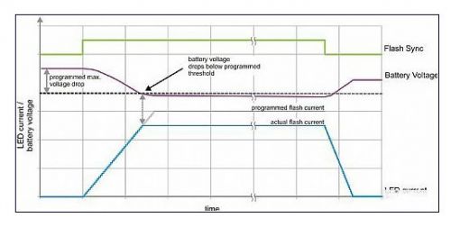 TI 擁有一種監控電池電壓的閃光燈驅動器技術。要獲得穩定的 LED 電流波形并且避免過多的電池壓降,閃光燈驅動器要主動控制 LED 電流上升/下降順序。在上升階段(上升斜率為 25mA/12?s),要對輸入電壓進行監控。如果輸入電壓降至某個設定閾值以下,則器件即刻停止讓 LED 電流進一步上升至該設定閾值,并將閃光燈電流保持在實際電平,參見圖 5。