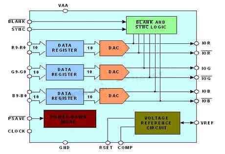 CS7123還有SYNC同步信號和BLANK黑電平控制信號這兩個附加的視頻控制信號,CS7123也具有一個待電模式。CS7123采用5V CMOS工藝制造,單片CMOS結(jié)構(gòu)確保了低功耗性能。CS7123的主要功能是將三路RGB信號轉(zhuǎn)換為模擬RGB信號后輸出到顯示屏顯示。另外,它也可以當作三路單獨的DAC使用。