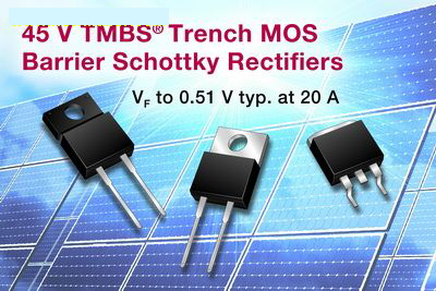 Vishay發(fā)布12個(gè)采用不同封裝的45V TMBS® TrenchMOS勢壘肖特基整流器器件可用于光伏太陽能電池旁路保護(hù),具有10A~40A的寬額定電流范圍,在20A電流下的典型VF低至0.51V。