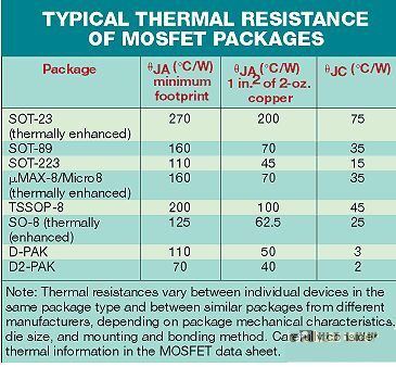 例如,采用1平方英寸的銅片,D-Pak的ΘJAD-Pak可能是50°C/W。但如果銅片就設在封裝引腳下,ΘJA值將會加倍(參見表)。采用多個并聯MOSFET,ΘJA主要依賴于它所安裝的銅片面積。兩個元器件的等效ΘJA可能是只有一個元器件時的一半,除非銅片的面積加倍。就是說,增加并聯MOSFET而不同時增加銅片面積,將使RDS(ON)減半,但對ΘJA的改變小得多。