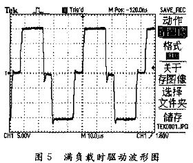 由圖3和圖4比較可以看出,在較小延時(shí)的情況下,應(yīng)把尖峰減到最小。從圖3可以看出,要減小的尖峰主要是負(fù)脈沖后沿的過沖尖峰,因?yàn)檫@個(gè)尖峰極有可能達(dá)到IGBT的開啟電壓(Vth),這樣就會(huì)造成同一橋臂的兩個(gè)IGBT直通;同時(shí)由圖5可以看出,在滿負(fù)載(600 V/30 A)狀態(tài)下,驅(qū)動(dòng)波形具有很好的穩(wěn)定性,而且沒有大的尖峰,這就保證了IGBT穩(wěn)定、安全的工作。
