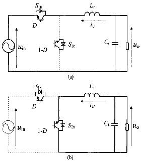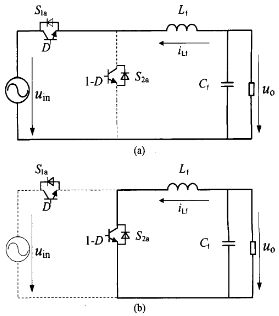 當開關管S1b開通、S2b關斷時,輸入電壓通過開關管S1b、電感Lf給電容Cf和負載供電,如圖4(a)所示;當開關管S1b斷開,S2b開通時,電感電流iLf經(jīng)Lf、開關管S2b的反向二極管、Cf和負載續(xù)流,Lf和Cf共同向負載供電,如圖4(b)所示。