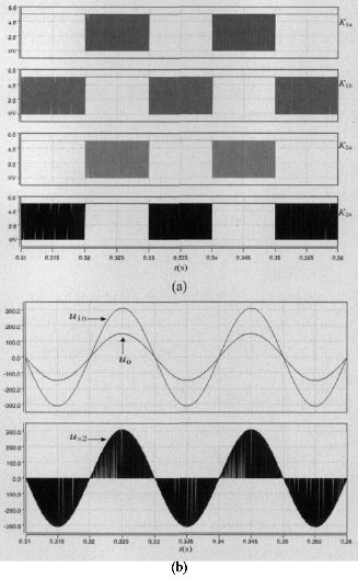 開關管S1a、S1b、S2a、S2b的控制信號K1a、K1b、K2a、K2b的仿真波形如圖7(a)所示。當輸入電壓大于零時,開關管S1b、S2b恒通,S1a、S2a高頻互補開通;當輸入電壓小于零時,開關管S1a、S2a恒通,S1b、S2b高頻互補開通。圖7(b)為輸入電壓uin、輸出電壓uo和交流開關管S2的兩端(即S2a、S2b兩管D(漏極)-D(漏極)之間的)電壓波形uS2。
