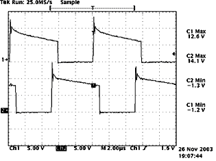 (b)圖中,示意了隔離變壓器副邊輸出的兩路驅(qū)動波形,可以直接驅(qū)動開關管。從圖中可以看出驅(qū)動波形比較理想:有快速的上升沿,并在一開始有一定的過沖,可以加速開通,減小了開通損耗;同時,有反偏截止電壓,提供了足夠的反相門極驅(qū)動,減小了下降時間;很好地驗證了驅(qū)動電路的設計是合理的。