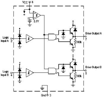 MC34152的外圍電路簡單,應用方便。它是8管腳的同相推挽驅(qū)動芯片,具體的內(nèi)部結構和封裝如圖4所示。2,4腳為兩路控制信號輸入,經(jīng)過芯片內(nèi)部的推挽放大,直接輸出同相的兩路驅(qū)動信號(7,5腳)。為使芯片更加穩(wěn)定地工作,一般在芯片的電源端并聯(lián)一個濾去高頻干擾的瓷片電容和一個濾去低頻干擾的電解電容。