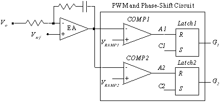 如圖3所示,時鐘信號C1和C2相差180度,它們分別對應的鋸 VRAMP1 和 VRAMP2 也相差180度,電壓誤差放大器的輸出信號 VEA、Vo 分別與 VRAMP1 和 VRAMP2 相比較,再通過兩個RS觸發(fā)器得到相差180度的驅(qū)動信號 G1 和 G2 。