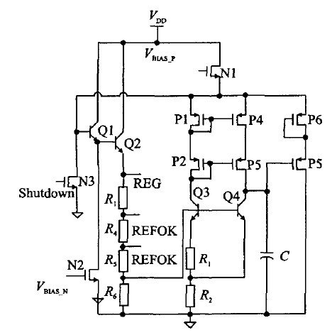 圖5為5 V穩定電壓源(REG)的電路原理。其中P1、P2、P3、P4組成共源共柵結構,可以提高電流鏡的鏡像精度,同時提高電源抑制比。Q3、Q4、R 1、R2組成一個帶隙基準電壓,這樣可以減小額外的電流支路,降低功耗。Q1、Q2組成達林頓結構,增加輸出能力。P5、P6增加匹配,減小溝道長度調制效應。Q1、Q2、R3、R4、R5、R6、Q4、P5、P6組成一個負反饋環路,將REG電壓穩定在5 V。圖中C具有兩種作用:1、記憶直流工作點;2、補償環路電容。