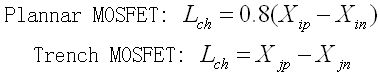可見閾值電壓主要與基區(qū)摻雜濃度(p-)、柵氧化層厚度(Toxg)、耗盡層電荷(Qdep)相關(guān)。式中前兩項因子對Trench MOSFET和Plannar MOSFET而言相同,而第三項則不同,因為耗盡層電荷與溝道長度有關(guān),兩者的溝道長度表達(dá)式為