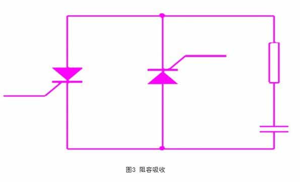在晶閘管兩端并聯r-c阻容吸收回路,如圖3所示,利用電容吸收過壓。其實質就是將造成過電壓的能量變成電場能量儲存到電容中,然后釋放到電阻中消耗掉。