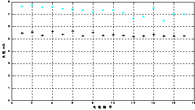 對12V100Ah開口蓄電池,分別采用HIOKI3550內阻測試儀(工作頻率1000Hz,測量電流為幾十mA)和BM6500(工作頻率10Hz,測量電流1A)測量17只電池的內阻,其結果如圖2-8所示,圖中“☆”為BM6500測得的數值,“+”是HIOKI3550所測得數值??梢夿M6500所測數據均比HIOKI3550的數值高。但從圖2-8還發現,兩種方法測量的數據差值并不是一個恒值或者固定比例。