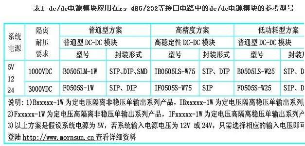 (4) DC/DC電源模塊應用在rs-485/232等接口電路中的DC/DC電源模塊的型號參考,如表1所示。