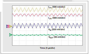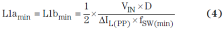 在理想緊密型耦合電感中,每個電感的單芯上都有相同的繞組數,這時耦合迫使紋波電流在兩個耦合電感之間等分。在現實耦合電感中,電感并沒有相等的電感,并且紋波電流也不會完全相等。無論如何,在理想紋波電流值的情況下,如果存在兩個單獨的電感,則我們將耦合電感中要求的電感估算為實際需要的一半,如方程式 4 所示: