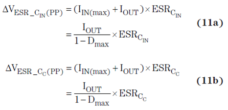 方程式 11a 和 11b 計算了完全由各自電容器 ESR 值引起的輸出紋波電壓部分: