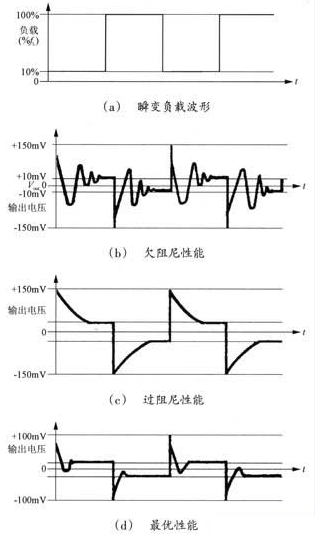 圖3(b)為阻尼響應,控制環在瞬變邊緣之后帶有振蕩。說明擁有這種響應電源的增益裕度和相位裕度都很小,且只能在某些特定條件下才能穩定。因此,要盡量避免這種類型的響應,補償網絡也應該調整在稍低的頻率下滑離。