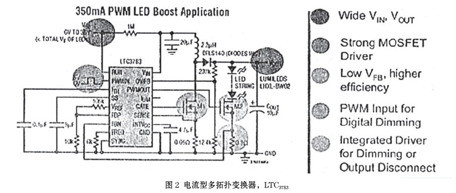 裝有LTC3783 LED驅動器在汽車上應用時,具有以下很重要的特點:(1)大電流、為輸出大的電流(≥1.5A),LTC3783驅動外部的N溝道MOSFET,可給高亮度(HB)和超高亮度(SHB) LED供電;(2)高電壓、LTC3783 3V~36V的輸入運作和輸出電壓,取決于外部功率元件的選擇,這可按標準確定,易于驅動LED燈串或混串(串+并);(3)保護。對HB LED的保護,需要IC結合精確的電流和輸出電壓調節。附加保護包括過電壓、過電流和軟啟動;(4)調光、以純色PWM3000∶1數字式調光時,在寬廣的調光比下保持LED恒定的顏色。而且,LTC3783還能附加模擬100∶1的調光。