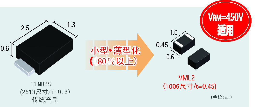 這次,羅姆通過改善結構設計和裝配工藝使封裝得到優化,成功開發出了世界最小的“VML2”封裝(1006尺寸∶1.0mm×0.6mm)快速恢復二極管。與傳統的2513尺寸(2.5mm×1.3mm)相比,體積減少約86%。不僅體積小巧,高達450V耐壓特性也是其特長之一。