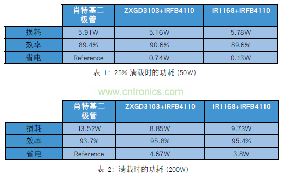 總之,隨著 ZXGD3103 和 IR1168 的面市,在 LLC 電路的輸出階段實施同步整流有望變得切實可行。 這種新技術似乎在 25% 滿載至 100% 滿載的范圍內都可以實現電源節省。