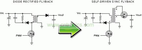 在傳統的二極管整流反向轉換器中,輸出二極管整流器是產生功率損耗的一個重要原因。輸出二極管的平均電流等于 DC 輸出電流,而峰值電流可能是其數倍,具體情況取決于占空比。肖特基二極管的二極管正向壓降通常為 0.5V,而標準 PN 結型二極管的二極管正向壓降為 0.8V。這種大正向壓降會帶來二極管中相對較高的損耗,大大降低了效率。使用同步 MOSFET 來替代二極管可極大地降低這些傳導損耗。圖 1 描述了標準二極管整流反向電源如何被轉換為自驅動同步反向電源。