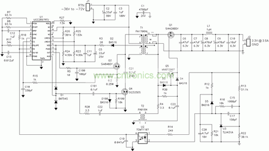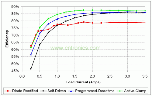 如果注重輕負載效率和成本最低化,那么依靠“簡單的”二極管整流反向電路來獲得效率提高則較為困難。如果您的要求沒有那么苛刻,那么選用自驅動同步 MOSFET 驅動便可以最低成本實現較大的效率增益。在使用 UCC2897 控制器的一次側 MOSFET 和二次側同步 MOSFET 之間添加可編程柵極驅動延遲,可以提高輕負載效率。利用有源鉗位電路,已被證實與典型的二極管整流反向轉換器相比,其可提高約 10% 的滿負載效率,而在輕負載時效率會有所下降。另一個好處是在整個滿輸出負載范圍內都保持了“連續導電模式”,從而保持了卓越的輕負載瞬態性能。本文敘述的每一種電路改進方法都可降低電路損耗,但都會帶來設計成本的增加。因此,請根據您的預算來決定您要達到的環保水平!